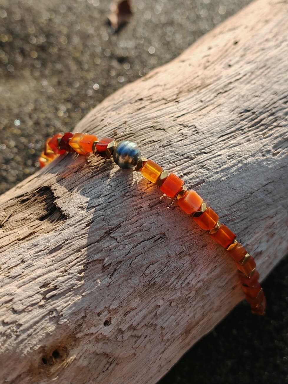 Bracelet vibrant avec perles de Tahiti et agate rouge, pierre de vitalite, de courage et de joie rayonnante.