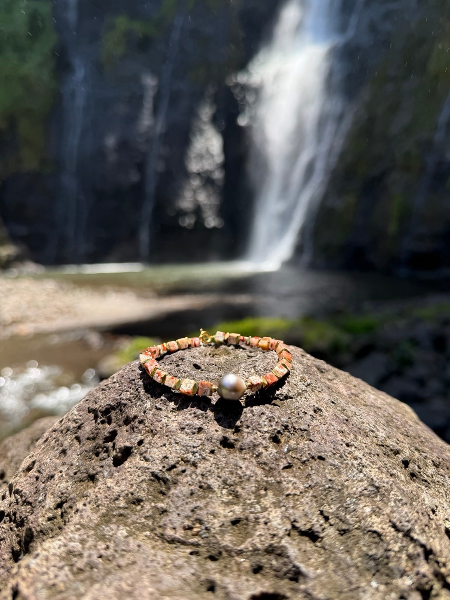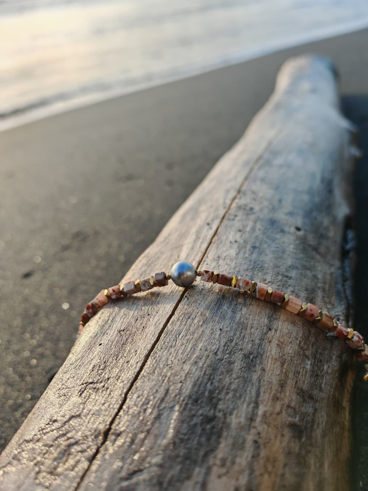 Bracelet unique avec perles de Tahiti et jaspe Arc-en-Ciel aux reflets multicolores, pour le courage et la transformation.