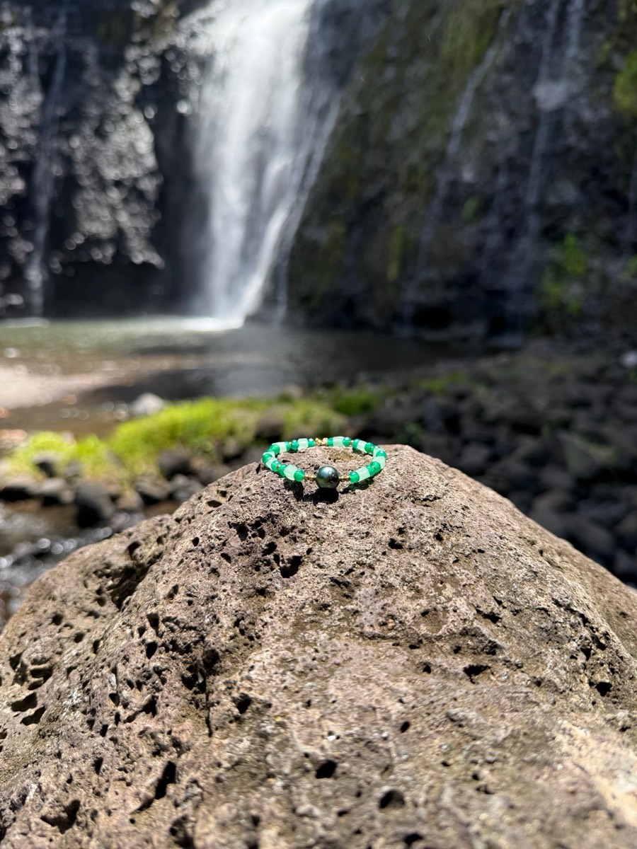 Bracelet de perles de Tahiti sublime par l'agate verte et l'aventurine, pierres du courage et de l'abondance.