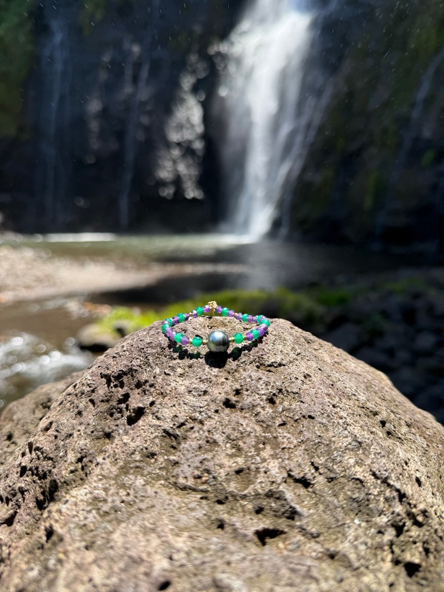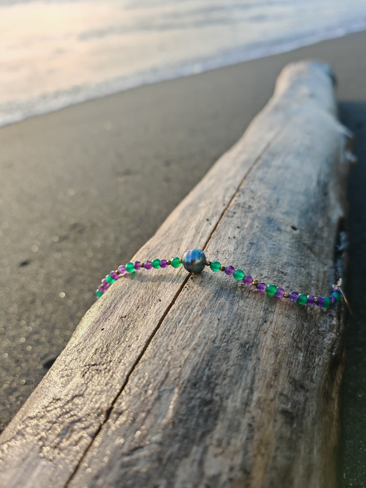 Bracelet spirituel avec perles de Tahiti, agate verte et amethyste violette, pierre de serenite et de sagesse.