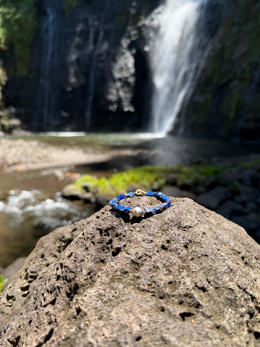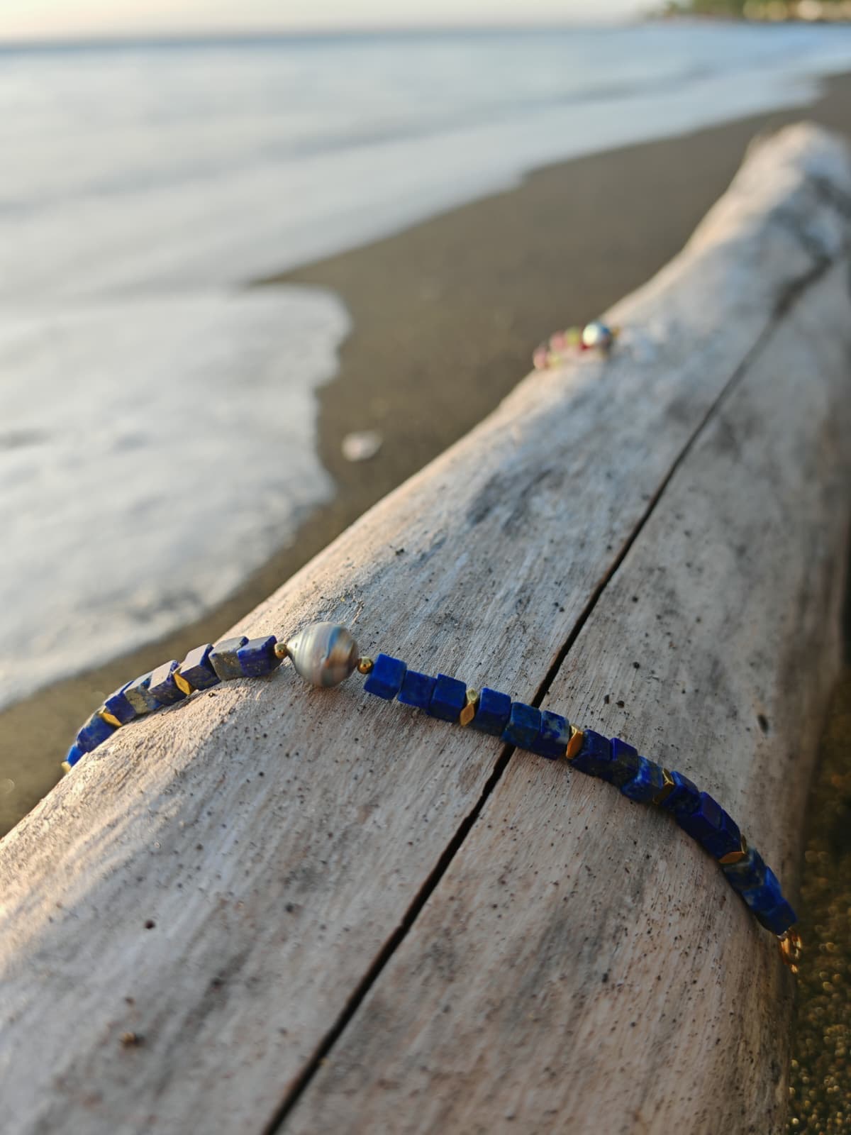 Bracelet noble avec perles de Tahiti et lapis lazuli bleu profond, pierre de discipline et d'ancrage.