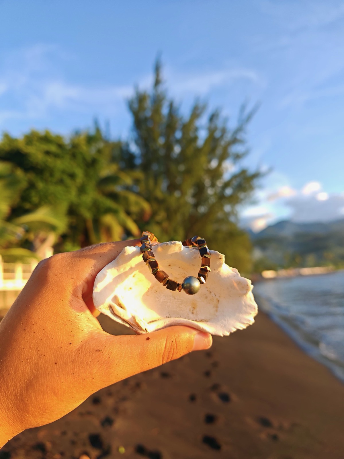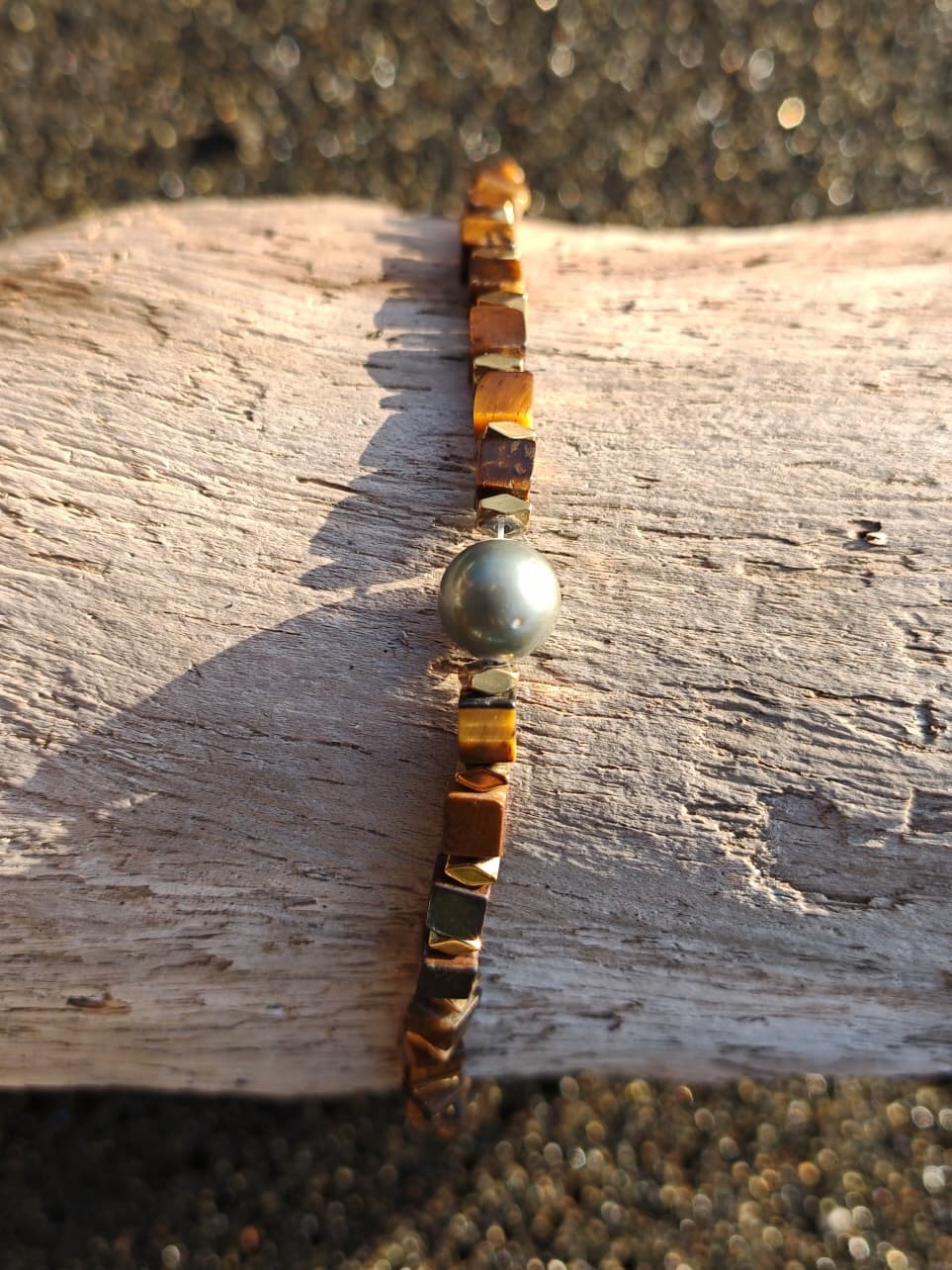 Bracelet puissant avec perles de Tahiti et oeil de tigre, pierre de protection, de confiance en soi et d'ancrage.
