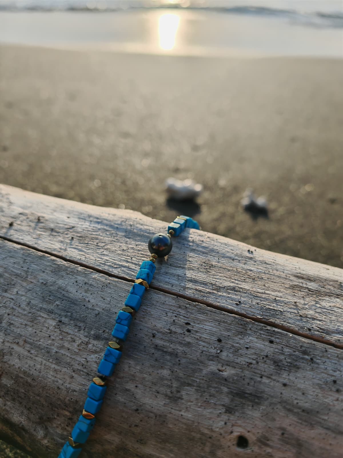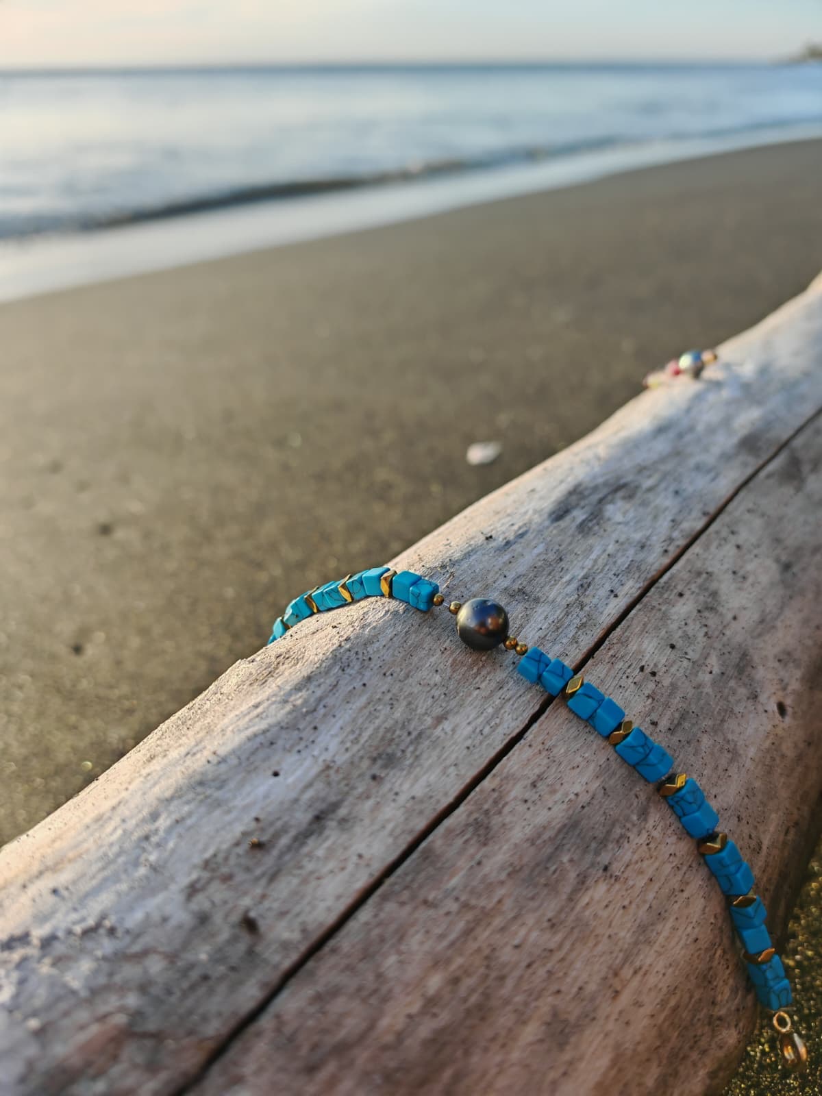 Bracelet aventurier avec perles de Tahiti et turquoise, pierre de sagesse et d'innovation.