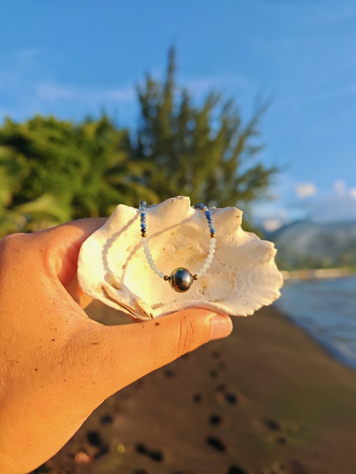 Collier elegant alliant lapis lazuli profond et aigue-marine, deux pierres de communication, de clarte mentale et d'apaisement, pour exprimer son authenticite avec serenite.